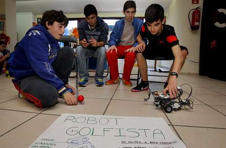 ¿Quién dijo que la robótica era cosa de mayores? Alumnos del instituto Número Un demostraron ayer que como inventores tienen mucho futuro. Fue en el marco de la Feira da Educación, en la que participan una veintena de centros formativos del municipio y que celebra esta primavera su primera edición. El auditorio fue el escenario en el que rodaron robots de lo más originales. Incluso había uno golfista que empujaba una pelota roja y detectaba los objetos a través de un sensor.